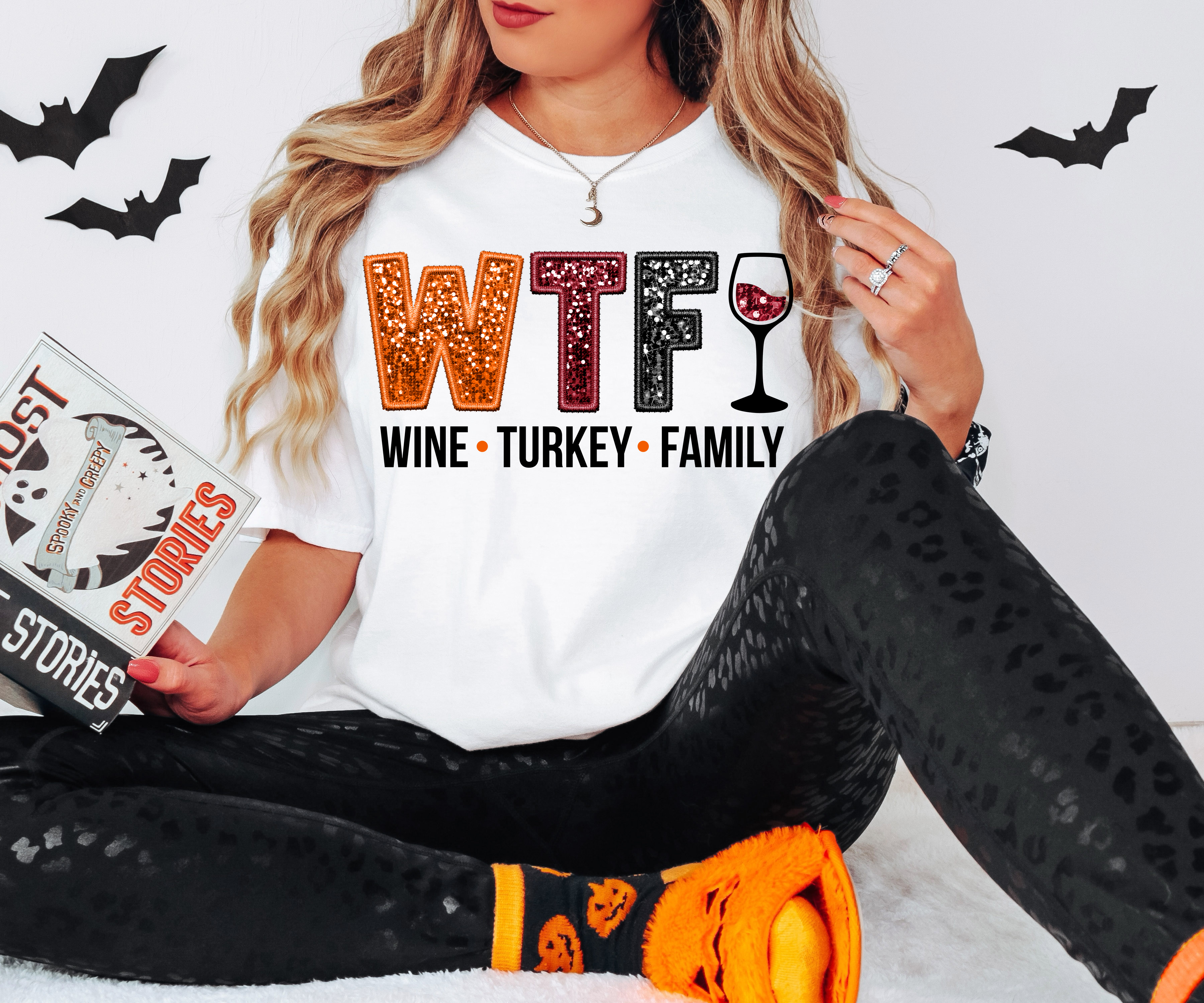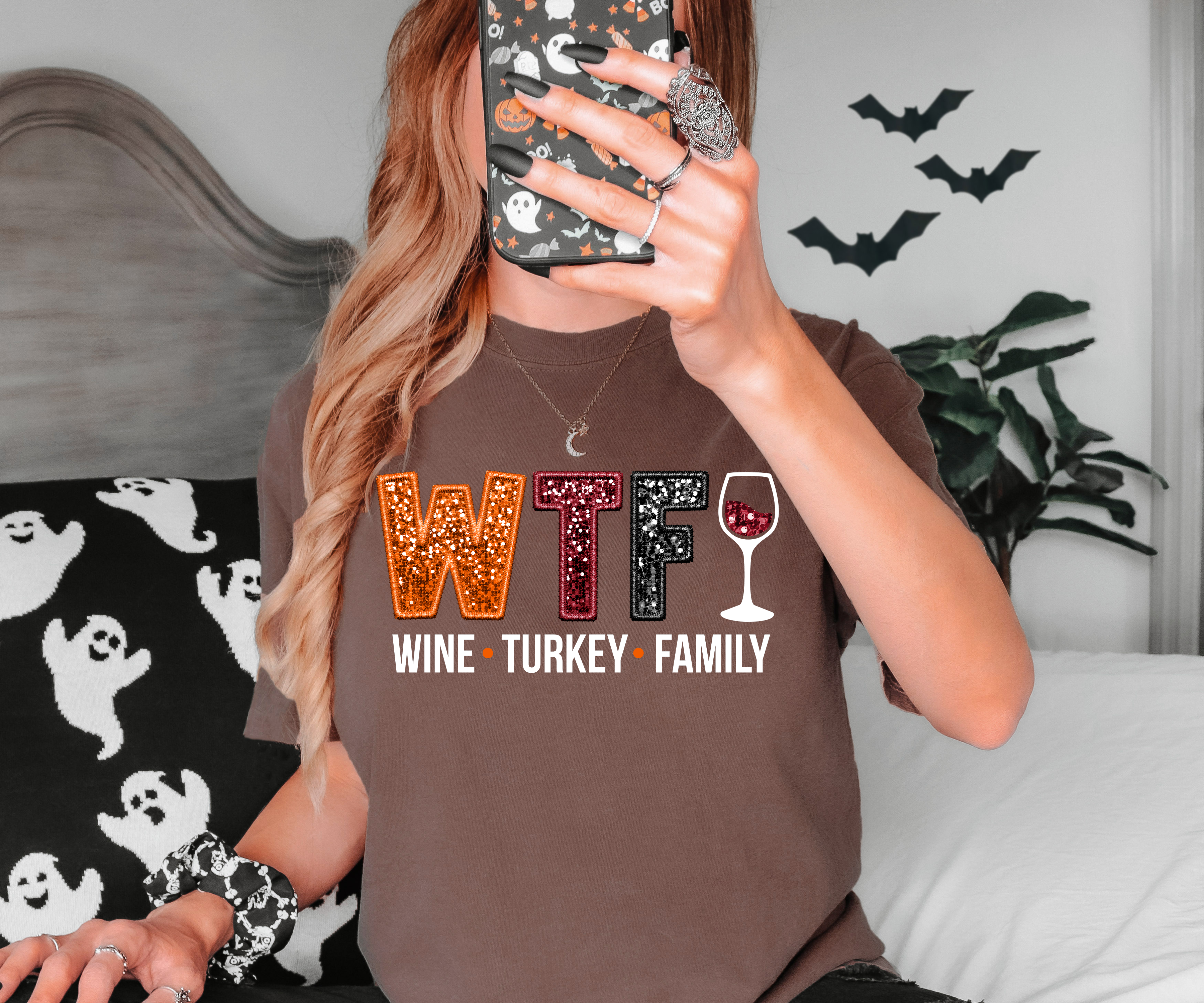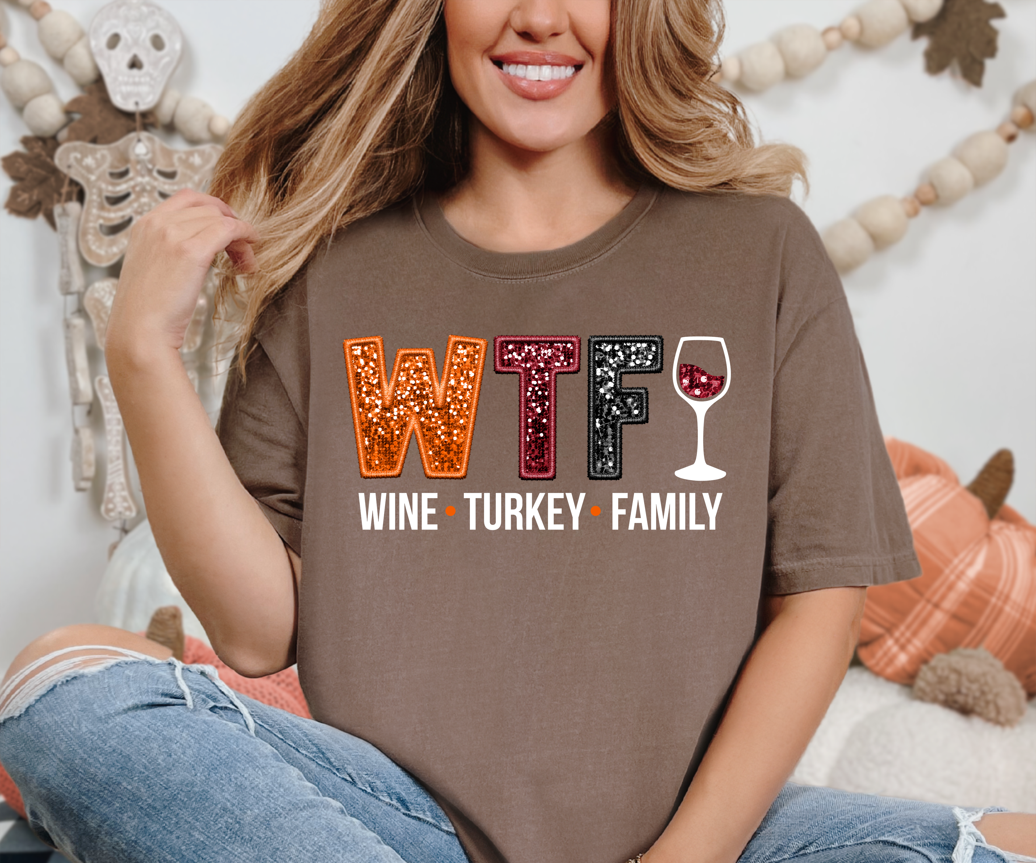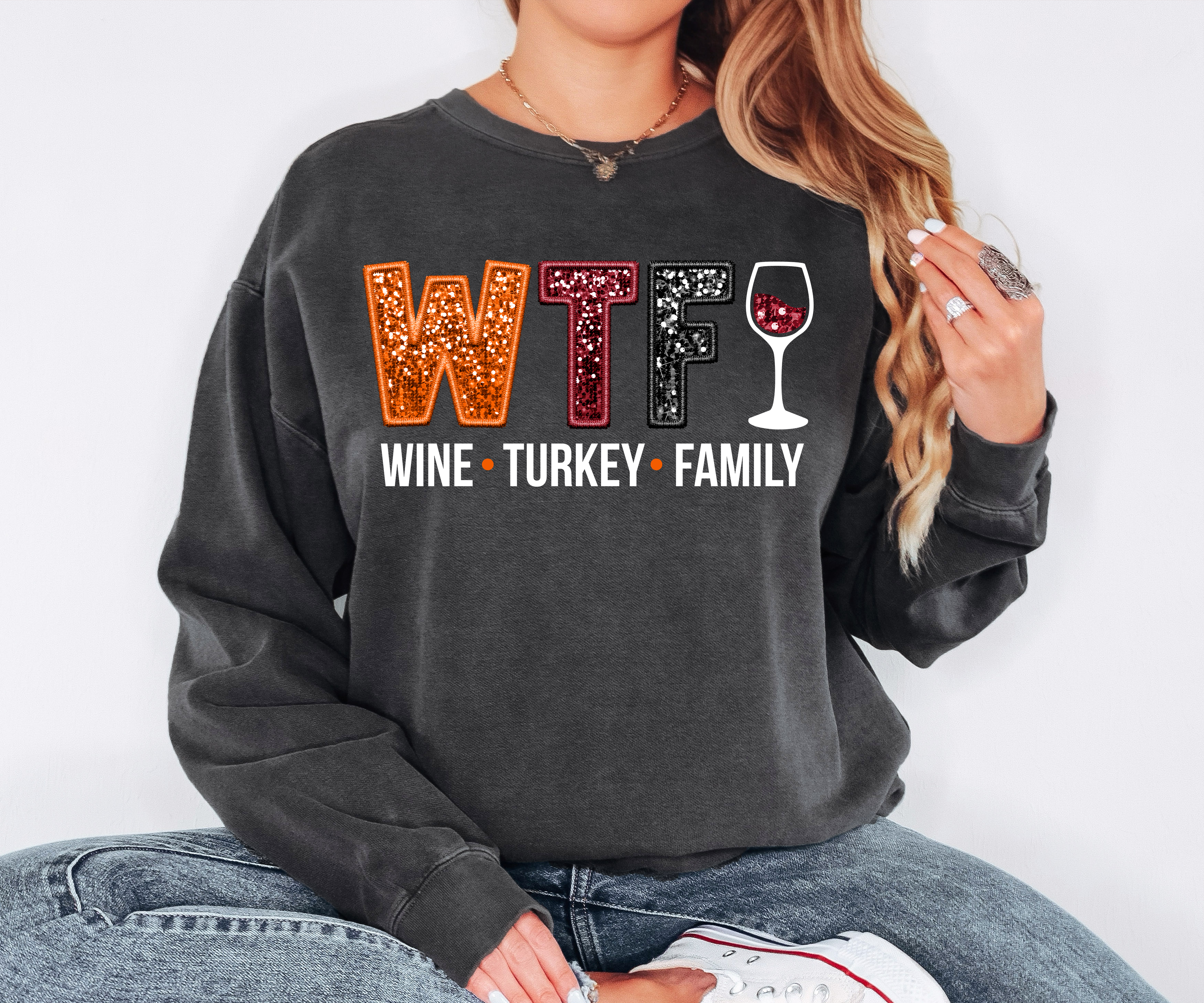 WTF Wine Turkey Family Faux Sequin DTF Print