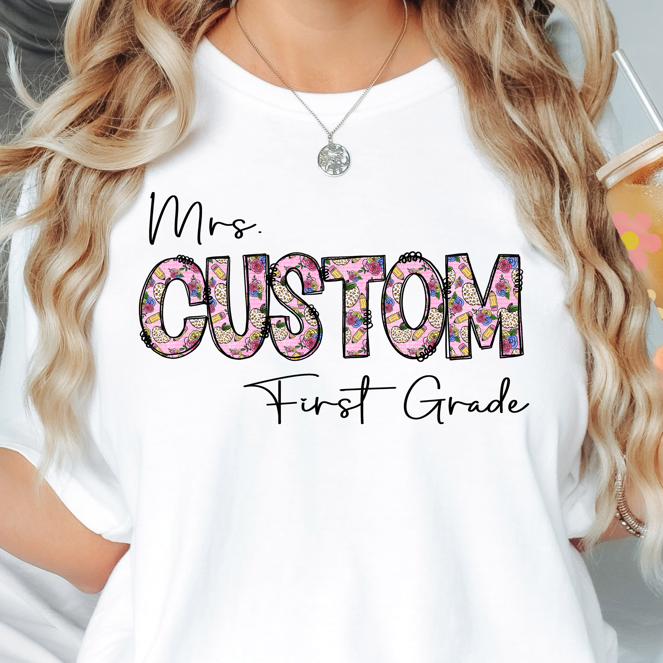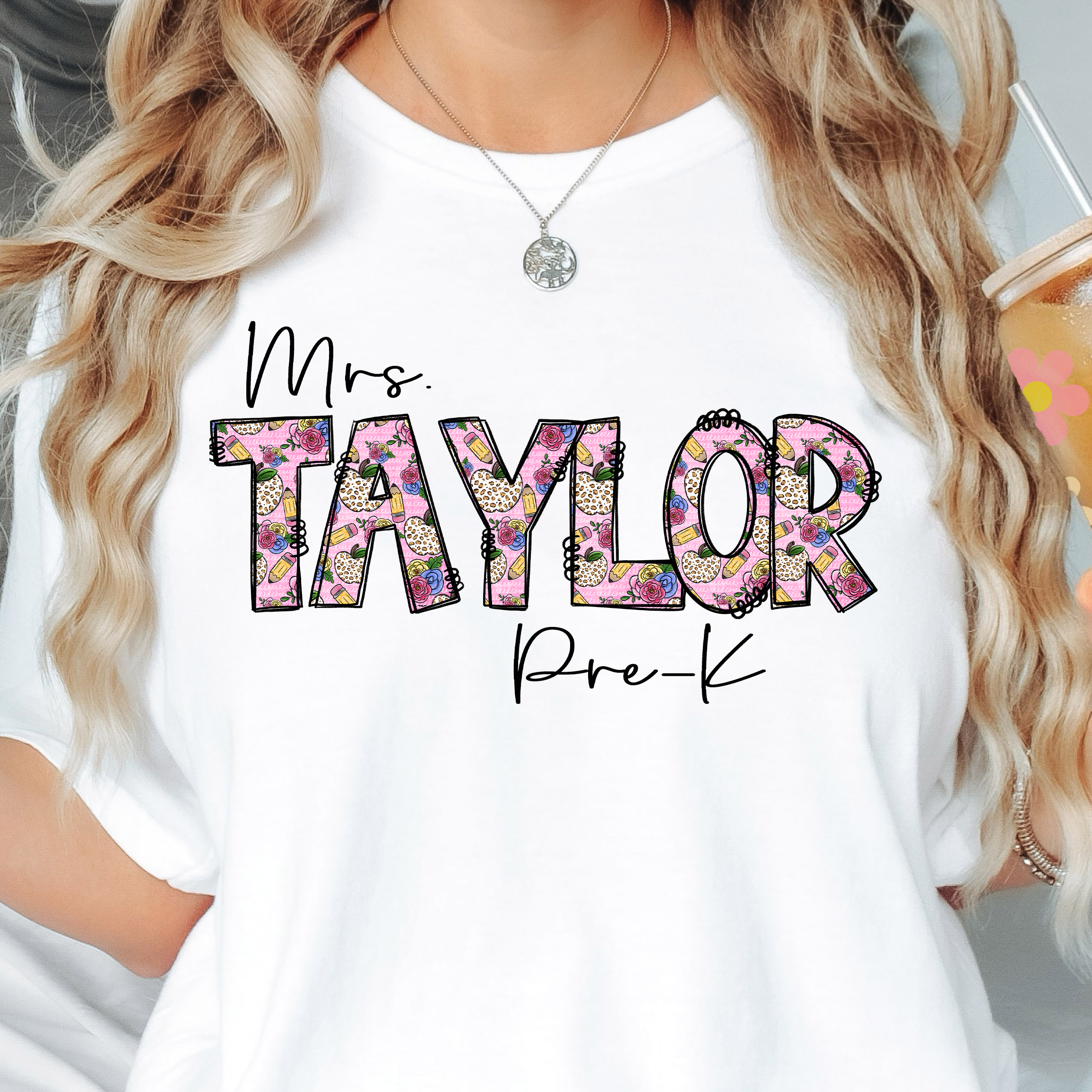 Custom Teacher Pink Floral Doodle DTF Print