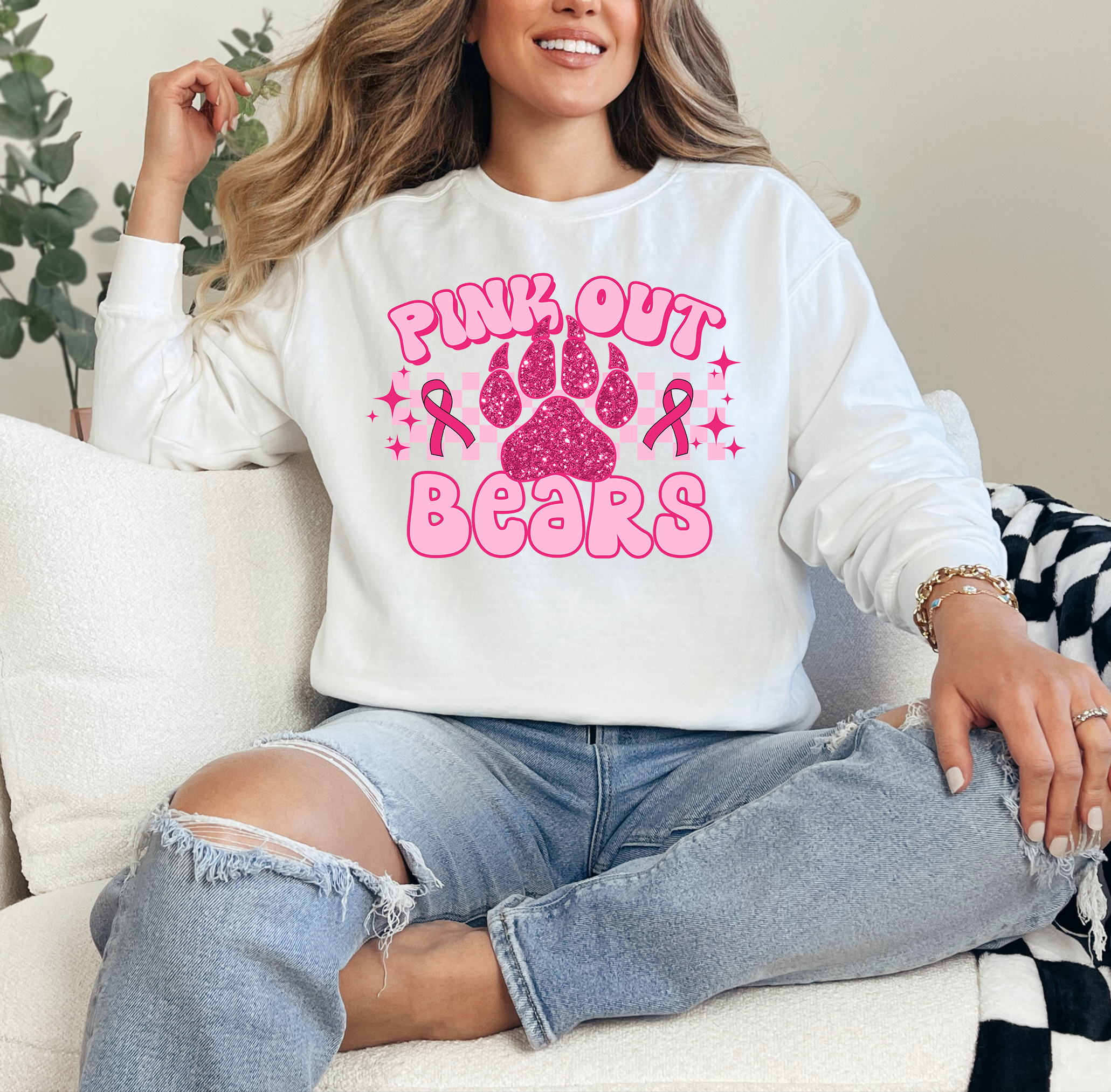 Pink Out Bears Glitter Effect Checker DTF Print