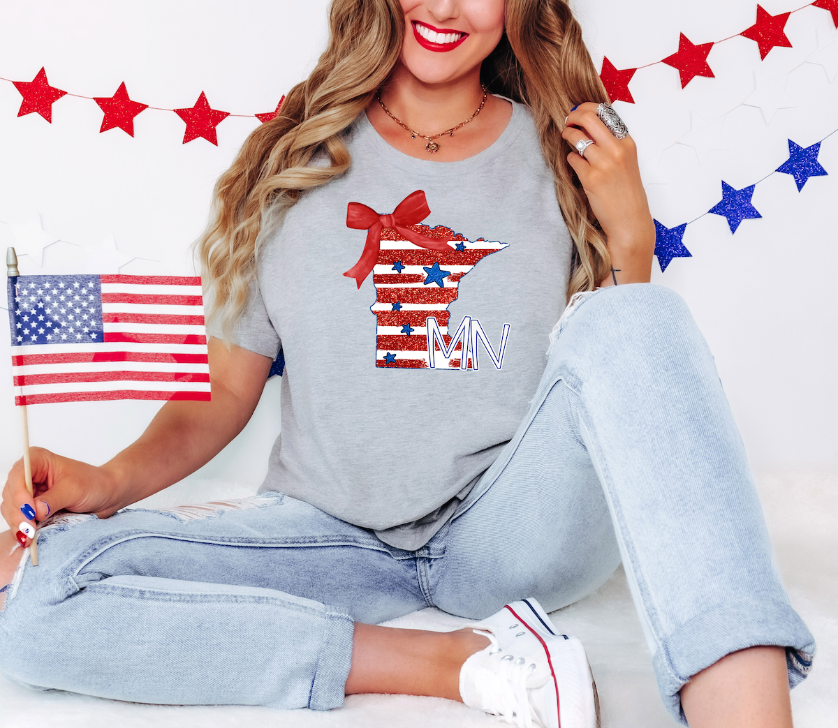 Patriotic MN Stars Stripes Glitter Blue Bow DTF Print